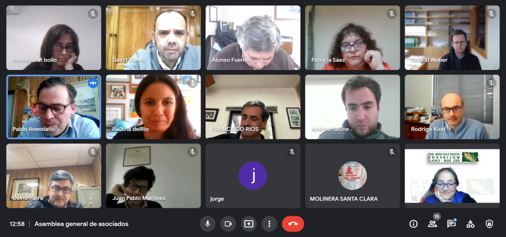 El martes 10 de mayo se llevó a cabo, a través de una videoconferencia, la primera asamblea general de socios del año 2022. La reunión fue liderada por el Sr. David Vivero Arriagada, presidente de la Asociación de Molineros del Sur A.G., y contó con la asistencia de los asociados Sr. Pablo Avendaño Hoffmann, Sra. Montserrat Bollo Dragnic, Sr. Jorge Aubel, Sr. Alonso Fuentes, Sr. Andrés Yanine, Sr. Rodrigo Kind, Sr. David Parra, Sr. Francisco Ríos, Sr. Juan Pablo Martínez y Sr. Mario Yavar; además de la participación de la gerente de la asociación, Sra. Jeannette Danty; asistente administrativa, Sra. Patricia Sáez y la abogada Sra. Paulina del Río como testigo de fe.